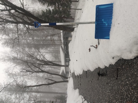 Blue shovel is an heirloom. The unbranded ergonomic aluminum handle and stress-mottled plastic scoop had been with my parents since I was shoveling a little suburban driveway growing up. My mother has informed me that there used to be a metal strip at the end. Given that I can't remember any such attachment, this shovel really has some age. It may even be older than yours truly. When my parents moved across the country, it came along with them. It was deposited in my garage as part of the division of their ever-hoarded possessions across our households. There it sat, idle for over a year, until I called it into service on February 24th.