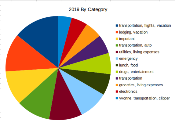 2019 was a pretty wild year for me. In March I was laid off (and given a loving severance + GDC tickets-- I love you guys) and started working elsewhere a month and some change later. The huge spike of expenses in May and July were when my then fiancee and I were reserving flights and an airbnb for our honeymoon in Saigon. The notable spike of income in September comes from wedding gifts. While 2019 was rather extraordinary, the expenditures were about on par with previous years. Each year we'd likely take one major international trip and a few short regional ones. In total, I saved 39% of my income this year.