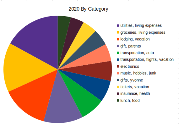 My biggest expense in both years by an order of magnitude is rent. I live in the Bay Area (for now) so it's to be expected that I'm shovelling a nice chunk of my income into the abyss. That means that most of the expenses shown in these charts would be expected to fluctuate based on lifestyle patterns. That being said, the utilities, living expenses category could be expected to remain roughly the same between years. However, increased time at home in 2020 increased that expense by 15%. To be fair, for the month we were on our honeymoon, our power bill was $5.