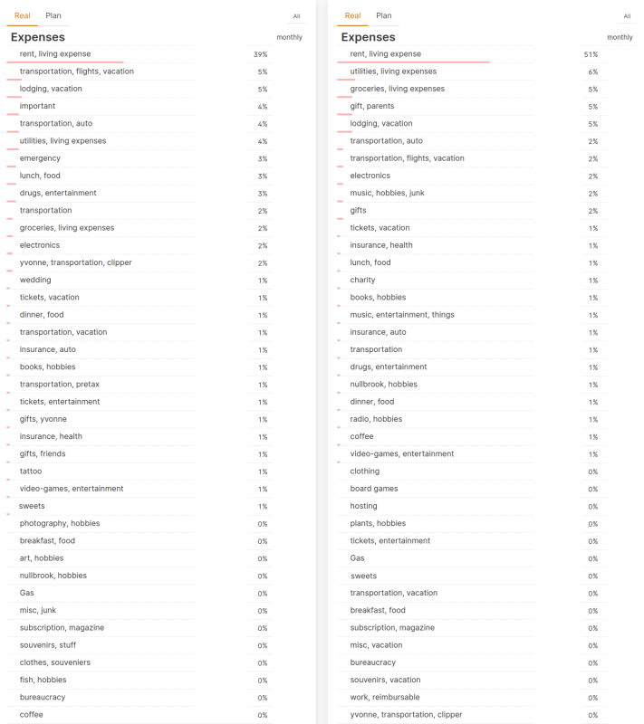 To speak to some of the categories of expenses here, the important label applied to wedding preparations and drugs, entertainment includes all forms of alcohol as well as cigarettes. The 70% drop-off of alcohol purchases can be attributed to shift from $10 bar beers to 50 cent grocery store beers. There's also the fact I remembered to write down the ~$500 of alcohol we spent in Vietnam. It was worth it to try actual absinthe. The most notable shifts in expenditures are in food and transportation. After the work-from-home order in February, I stopped having the convenience of $10-15 food, lunch shops within reach. I know several of those shops are closed for good. It's possible I'll be using the home meal prep skills I learned in quarantine to provide my own lunches in the future. The disappearance of the transportation and transportation, yvonne, clipper expense is the result of our BART commutes turning into memories. I do miss public transit, but I miss foreign public transit more.