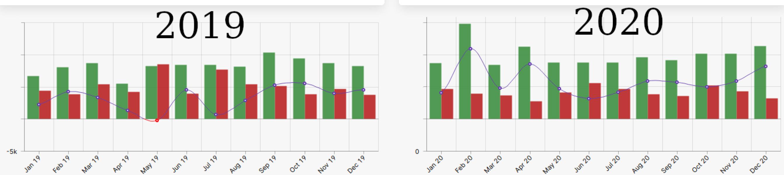 The year after has an obvious (at least to 2021 me) shift in spending. The income bump in February is my tax return while the bumps in April and December are from government covid relief checks. The few major expenditures were for a short (and failed) homefinding trip and a month-long visit to Ohio. The flights were incredibly cheap and surprisingly I didn't get sick. I saved 60% of my income in 2020.