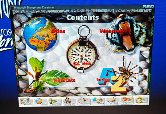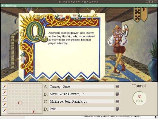 Around the same time as I was laying on the dirty, patterned floor of the Midpointe Middletown library and noisily crunching audiobook cassette tapes back into their form-fitting plastic enclosures, I was regularly going to a babysitter. It was probably 1998/99 and Rocko's Modern Life reruns, serving as a potent and surreal foil for Utopian Scholastic media, were on the TV. One of my strongest memories of my time staying there was watching quietly as the sitter (who was genuinely loving and amazing even if she let us watch cartoons half the day!) conversed with a jester in a 2.5D castle maze. Trivia questions, the answers to which I certainly didn't know if I could even read the words, led further and further in a strange, interactive journey of academic diversion. It would only be this year (2025!) that I would learn that the game was the Encarta Mindmaze mirror, part of the Microsoft Encarta encyclopedia.